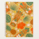 Impresión tropical hawaiana con tonos o naranjas, dorados, verdes y amarillos. Huella divertida que incorpora cabezas tiki totem, flores de hibisco y hojas de palma.