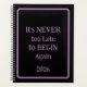 The new year will be here before you know it and what better way to keep all of those appointments organized but with this 'It's NEVER too Late to BEGIN Again 2026' planner. An encouraging phrase for everyone who thinks they can't start over. Black background. Lavender lettering. Lavender border. Perfect gift for yourself, a friend or loved one.