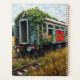 An old long abandoned vintage train off the tracks covered in graffiti and ivy while nature reclaims her space. You add your name in the personalize area.