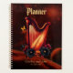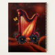 La melodía cósmica, la magia del arpa. El arpa irradia calidez y lujo, sus cuerdas doradas y su marco contrastan armoniosamente con las flores negras y naranjas que lo adornan. Estas flores son vibrantes y ricamente detalladas, dándole al instrumento una belleza natural y un toque mágico. El fondo transporta el visor a un escape espacial fascinante. Consta de nubes nórbidas profundas, azules y violetas, intercaladas con estrellas brillantes y planetas brillantes de diferentes tamaños y colores.