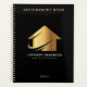 Moderno libro de citas en negro y oro de moda diseñado para inmobiliarios, constructores, contratistas y más. Diseño con icono de casa de oro en el frente con dos líneas de texto personalizado en un fondo negro, y añada todos sus detalles de contacto a la parte posterior y a los detalles de los medios sociales. Diseño moderno de moda a la moda.