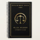 El moderno y elegante libro de citas para abogados /planner presenta un ícono de oro de escala de justicia en un fondo negro y nombre/ título en el frente. Personaliza tus datos en la parte posterior.