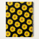Un patrón de girasoles amarillos brillantes sobre fondo negro con un monograma y nombre.