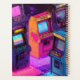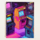 Un grupo de máquinas recreativas antiguas se iluminan con luces de neón vibrantes. La escena se sitúa en el fondo de una galaxia estrellada, creando una atmósfera nostálgica pero futurista.