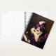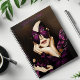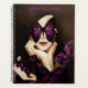 Una mujer con el pelo de morena y la máscara de la mascarada de una mariposa morada con mariposas violetas por todos lados en un fondo negro
