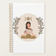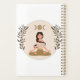 A round framed design with a triple moon / moon phases and leaf motif. Brown haired woman with a braid is meditating and flying.