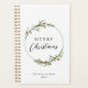 A Christmas planner featuring a minimalist watercolor wreath with red floral and green foliage accents. This elegant wreath frames the greeting "Merry Christmas". Easy to personalize with your family name.