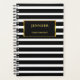 Patrón de rayas blancas y negras de moda con planner de marco dorado y negro. Puede personalizarlo y agregar su propio nombre y texto al frente.