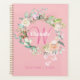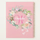 Planner de monograma inicial de color rosa bonito 2023, con un hermoso nombre de guión blanco con una inicial de color rosado que se enmarca en una delicada guirnalda rosa floral de acuarela sobre un fondo rosado de melocotón. Diseñado por Thisisnotme©