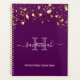 Un elegante fondo de color violeta oscuro femenino y elegante con brillantes estrellas de oro que gotean, gotean. Personalice y añada su nombre, letra de monograma y un título. Un planificador para organizar clientes de negocios, citas, listas o tu vida diaria. El nombre está escrito con un gran guión escrito a mano con letras a la moda y chispas. Para que los cambios sólo eliminen el nombre del ejemplo, deje los espacios o la emoji delante y después del nombre. Letras rosa claro y violeta.
