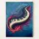Music in motion, the curved piano. The keyboard consists of classic white and black keys, clearly separated from each other and set against a dark frame. This frame creates an elegant contrast and highlights the keys. A dynamic, artistic element unfolds around the keyboard: flowing shapes in vibrant red, purple, and gray tones seem to creep out from the keyboard or surround it. These shapes are curved and organically designed.