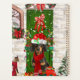 Perro Dachshund sentado afuera de la casa decorada con corona de Navidades, árbol de Navidad es una idea de regalo perfecta para los amantes del perro.