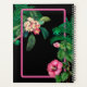 Una moderna pero retro temática neón rosado botánico sobre fondo negro. Un bonito diseño ideal para el verano. Diseño perfecto de plantas tropicales de neón rosa con palmeras, flores rosadas de Hibiscus y flores Plumerias Frangipanis. Los colores negro, rosa y verde dominan este diseño de neón rosa tropical.