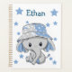 Diseño de niño elefante pequeño. Un adorable elefante bebé sentado feliz, con su pequeño gorra y estrellas. Personalizar a su gusto.