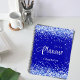 Fondo azul real, decorado con polvo falso purpurina, chispas. Personalice y agregue un año y un nombre. Letras blancas.