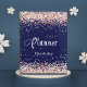 Fondo azul marino. oro Rosa, polvo falso purpurina. Personalice y agregue un año y un nombre. Letras blancas.