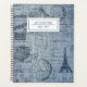Este elegante cuaderno de planificación presenta un diseño vintage del denim, que incluye dibujos de la Torre Eiffel, un reloj de bolsillo, una máquina de escribir, un sello postal y más. Fácil de personalizar para cualquier uso - un regalo, de vuelta a la escuela, universidad, adolescentes, madres, etc! La parte posterior contiene el mismo diseño de fondo que la parte delantera. ¡Ideal para alguien que necesita estar organizado!