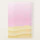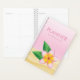 Este planificador tropical presenta el ilustracion de Destei de una hermosa flor frangipani de color rosa con dos hojas verdes. El fondo está decorado con una temática playera que incluye una textura de arena, mientras que el color de fondo es rosa. Hay áreas de texto personalizables para el título del planificador y para un nombre en el frente.