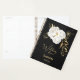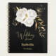 hermosas flores blancas y hojas de oro elegante planificador de boda negra