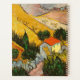 Paisaje con House y Plowman. Vincent Willem van Gogh. Paisaje en colores cálidos y brillantes. Hay una casa con un techo rojo cerca de la carretera. Los campos amarillos suben por las laderas. En el campo, un hombre con un caballo está cosechando. Reproducción de obras famosas de imágenes artísticas de dominio público.