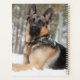 Perro pastor alemán posando en la nieve con una bandana de color camoflaug.