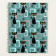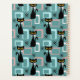 Colorido patrón de estilo abstracto de mediados de siglo con gato negro, estrellas negras y cubos coloridos (azul, blanco, rosa) con fondo turquesa para cada amante del gato, mamá del gato y papá del gato.