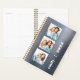 Personalizar fácilmente este planificador moderno reemplazando las tres imágenes de muestra con tus fotos cuadradas favoritas. Añada su nombre o iniciales de monograma y el año en tipografía blanca chunky sobre un fondo metalizado de imitación de color plateado.