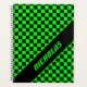 Impresión personalizada de planificador Guay con patrón clásico de neón verde y negro a cuadros y nombre personalizado en fondo negro. Puede personalizarse agregando su nombre u otro texto y cambiando el estilo de fuente, el tamaño de la fuente y el color de la fuente. Perfecto para el registro de balas, la programación, la gestión de contactos o para realizar un seguimiento de sus reuniones y cumpleaños de sus amigos y familiares.