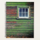 Este planificador tiene una foto de una ventana y una casa con pintura verde vieja.