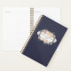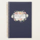 Comience el nuevo año con estilo y siga sus citas y fecha clave con nuestro planificador floral de moda. El diseño personalizado cuenta con un rico fondo azul medianoche con su nombre y el año con una insignia floral acuarela con cúmulos de rosado, melocotón y crema rosa y flores de peonía.