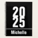 El 2025 está escrito en blanco sobre un planificador negro. En la parte inferior hay una línea de texto en blanco. Puede editar el texto para mostrar un nombre o un mensaje personalizado.