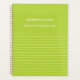 Manténgase organizado con estilo en este atrevido cuaderno de caracol verde con un diseño limpio y moderno. La portada incluye una línea de nombre "cliente" de personalizable y una segunda línea para su profesión, tema o cualquier texto que elija. La mitad inferior está acentuada por unas rayas horizontales nítidas que le confieren un aspecto fresco y contemporáneo. En el interior, encontrará páginas alineadas de alta calidad, perfectas para tomar notas, hacer periodismo o planificar. Ligero pero duradero, este portátil es ideal para estudiantes, profesionales o creativos que desean un toque personalizado a su papelería.