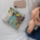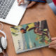 poster de viaje vintage de una jamaicana sentada cerca de una palmera disfrutando de la brisa del océano y maravillosas vistas a la costa
