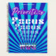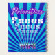 This vibrant design showcases the inspirational words, "Prioritize, Focus, Win!" in various fonts set against a colorful blue and teal background.