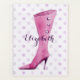 Moda de Stiletto - acuarela estilo imagen de una bota de tacón de estilete rosa púrpura moderna adornada con 3 botones, colocada sobre diferentes puntos de polka púrpura pálido y malva. Utilice la plantilla para personalizar con su nombre o mensaje en el tipo de letra de guión púrpura berenjena.