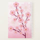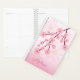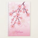 Esta agenda rosa presenta la ilustración de Destei de una rama de cerezo sakura florecida con flores rosadas. En la parte delantera también hay un área de texto personalizable para un nombre en fuente de color rosa.