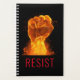 El planificador temático de la justicia social presenta un gran puño de fuego y llamas con el texto de personalizable "RESISTE" con un fondo negro de color rojo moderno.
