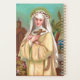 En esta encantadora representación de una huella devocional, el Rosa de Lima (1586-1617) se alza en un paisaje tropical peruano al caer la noche. Pequeñas estrellas amarillas brillan en el oscuro cielo azul-verde detrás de ella. Está flanqueada a la izquierda por una iglesia de tablón de madera marrón y a la derecha por una palmera que se balanceaba. Vestida con el hábito dominicano de color crema que se adapta a su pertenencia al Tercer Orden, lleva una corona de espinas en memoria de la pasión de Cristo sobre su velo blanco. Ella sostiene una armadura de rosas rosas rosas y una cruz de madera. + St. Rosa fue la primera persona nacida en las Américas en ser declarada santa y sigue siendo popular. Es la patrocinadora principal del Perú y de los pueblos indígenas de América Latina, copatrocinadora de Filipinas con San Pudentiana, patrocinadora de las Américas en general, y patrocinadora de Santa Rosa, California, y su Diócesis. Además, es la santa patrona de bordadores, jardineros y floristas. Naturalmente, rosas de todas las variedades se han convertido en su atributo. En el arte, la representan coronada de rosas, sosteniendo rosas (como aquí), o en un ambiente con rosas en macetas o arbustos rosas floridos. + Festín: 23 de agosto + Crédito de la imagen (M 024): Imagen antigua de San Rosa de Lima de un cromolitograma devocional impreso en Alemania, editorial original desconocido a finales del siglo XIX y principios del siglo XX, de la colección privada de ephemera religiosa del diseñador.