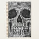 La cara de cráneo se acerca al planificador gótico de diseño en blanco y negro. Macabro, espeluznante, espeluznante, malvado, siniestro. Guay, material escolar de moda, moderno, único y aterrador inspirado en Halloween. Derechos de imagen de Marg Seregelyi Photography.