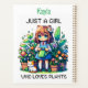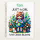 Arte de planificación personalizado para cualquier chica que ame las plantas. Gráfica ai personalizada en un estilo de videojuego de 8 bits. Chica con una lata de agua rodeada de muchas plantas.