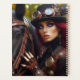 Una impresionante dama victoriana de vértigo oscura, con ojos azul penetrante, cabello rojo, gafas y sombrero de punta, se alza junto a su magnífico caballo negro con ropa de cuero y engranajes de reloj en un reino histórico de vértigo.