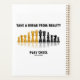 Muestra tu lado reflexivo como jugador de ajedrez con una dosis de humor de ajedrez irónico con este planificador con un juego de ajedrez reflexivo junto con el siguiente ajedrez diciendo: "Tomen un descanso del ajedrez de realidad". ¡Los ávidos jugadores de ajedrez y los profesores de ajedrez -particularmente aquellos que entienden el beneficio recreativo que puede ofrecer jugar al ajedrez- disfrutarán de este sólido planificador de consejos de ajedrez!