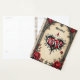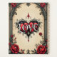 Un romance gótico. Marco gótico ornamentado que rodea un fondo beige. Roses rojos con hojas de color verde oscuro se organizan alrededor del marco, sobre todo en las esquinas. En el centro inferior hay un emblema decorativo en forma de corazón con la palabra "AMOR" inscrita en una fuente estilizada.