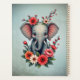 Un toque de verano: El elefante bebé en un mar de flores. Este diseño encantador se caracteriza por el ilustracion encantador de un pequeño elefante, pintado en delicados tonos grises. Sus orejas interiores rosas le dan un toque alegre y encantador. Sus grandes ojos expresivos irradian curiosidad y simpatía, mientras que su dulce expresión facial transmite una calidez pura. El elefante está suavemente rodeado de una gran variedad de flores coloridas en tonos rojos, naranjas, rosas y blancos.