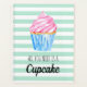 "Todo lo que necesitas es un quequito", cita divertida con ilustracion de quequitos acuarelas con hielo rosa. Un bonito fondo de rayas verdes y blancas pastel. Ilustracion acuarela de Kristine Lee. Para obtener más información, visite www.kristineleedesigns.com