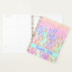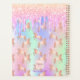 Un fondo holográfico de moda con colores pastel de unicornio y arcoiris en rosa, violeta, verde menta. Decorado con goteo en rosa, morado y con un patrón de unicornio de colores dorados. Personalice y añada un nombre y un año escrito con un guión de estilo con letras a mano moderno. Letras de color púrpura.