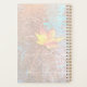 Beautiful calendar planner features vibrant colorful fallen autumnal maple leaves rest on wet concrete surface.
