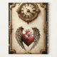 Vintage elegance: an elegant clock and heart. The focal point is a vintage clock with Roman numerals in an elegant gold tone. A winged heart, radiating in vibrant red, is adorned with gold accents that emphasize its contours and lend it a sophisticated shine. The heart's wings are richly detailed, with finely crafted gold feathers that radiate upward, lending the motif a dynamic lightness.