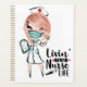 Una enfermera caucásica blanca y personalizado con el pelo largo de hombro rubio de fresa sujeta un portapapeles y lleva una máscara protectora. Está levantando la mano en un signo de paz y la letra, viviendo esa vida de enfermera, aparece a su derecha. Estos son regalos perfectos para madres, hermanas, hijas, nietas, sobrinas y mejores amigas que trabajan en un hospital o estudian para ser enfermeras.