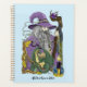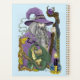 Un mago todo en púrpura sosteniendo un equipo que tiene una bola de cristal morado. Un pequeño dragón verde, nudo celta trabajando, vela y un borde de otoño deja todo en un fondo azul claro